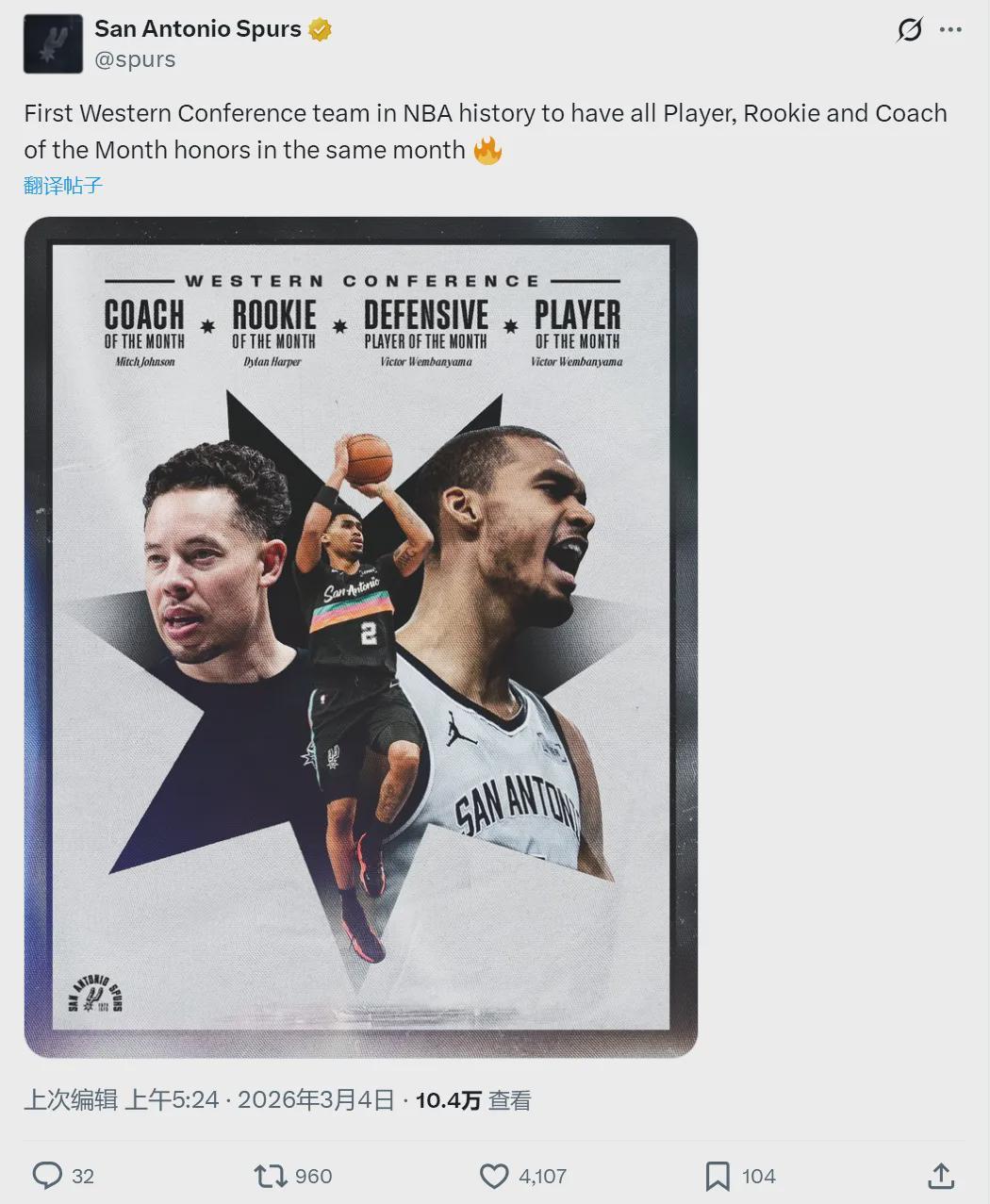 今天早上,NBA官方公布月最佳球员、教练和新秀等荣誉。马刺球星文班亚马和活塞球星坎宁安当选月最佳球员,马刺主帅米奇-约翰逊和骑士主帅阿特金森当选月最佳教练,马刺榜眼哈珀和黄蜂4号秀克尼佩尔当选月最佳新秀。