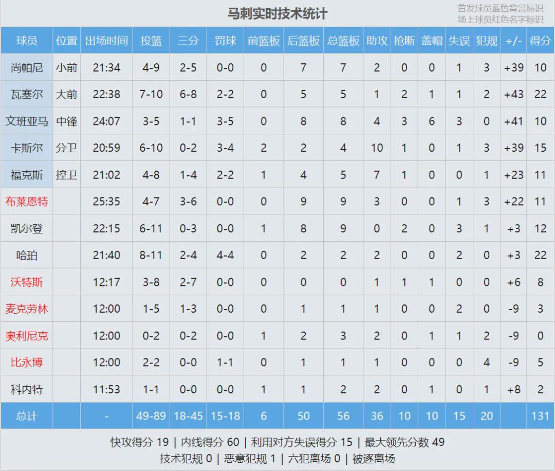 瓦塞尔出战23分钟,投篮10中7,三分8中6,罚球2中2,砍下22分5板1助2断1帽,正负值+43全场最高。瓦塞尔+43高居队史第二,仅次于邓肯的+45。哈珀22分2板2助、卡斯尔15分4板10助、文班亚马10分8板4助3断6帽。