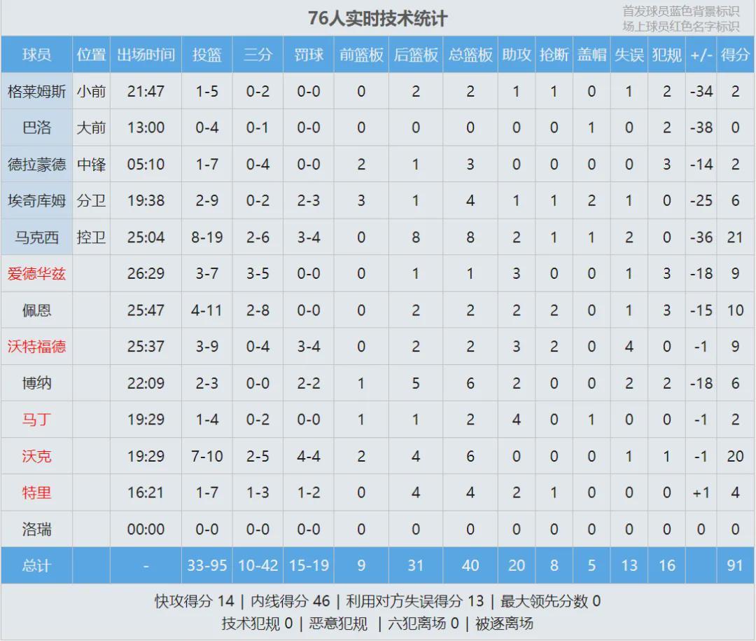北京时间3月4日,NBA常规赛:马刺131-91狂胜76人40分。恩比德因伤继续休战,乔治依然处在禁赛当中。四节比分如下(马刺在前):32-25、46-28、35-11、18-27。马刺最多领先到49分,比赛也早早进入垃圾时间。